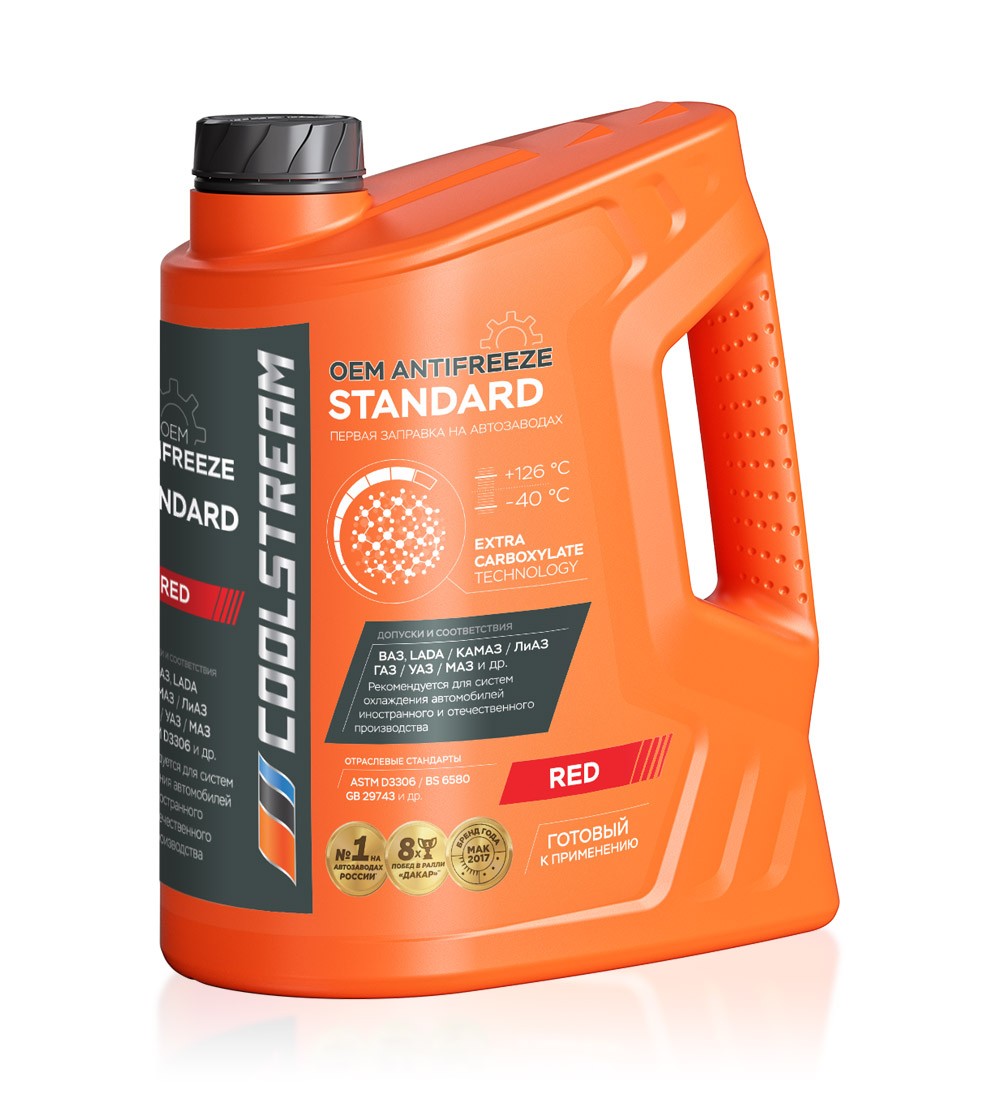 Coolstream Standard — 100% карбоксилатный антифриз (OAT), используемый для заправки в новые автомобили на заводах ГАЗ, КАМАЗ и др. Имеет официальный допуск АвтоВАЗ, прописан как рекомендованный антифриз в Руководстве по эксплуатации